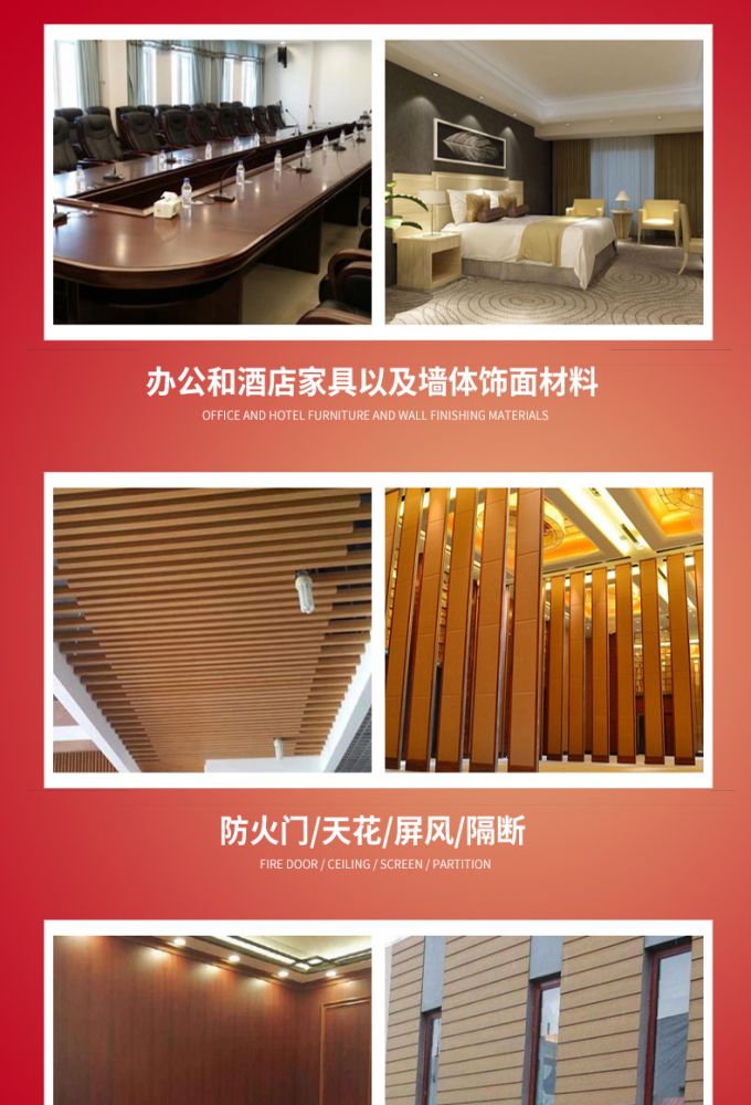 2、用于各式辦公和酒店家具,防火門,天花,屏風(fēng),隔斷;